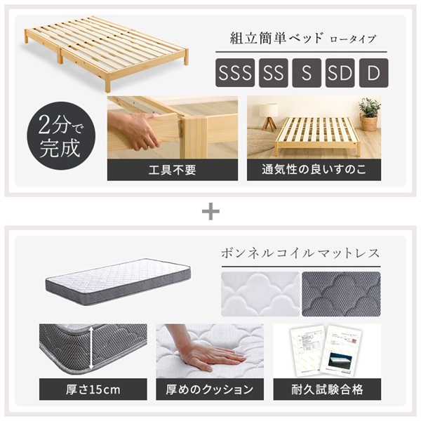 マットレスD:(約)幅140×奥行195×高さ15cm(コイル数:392個)